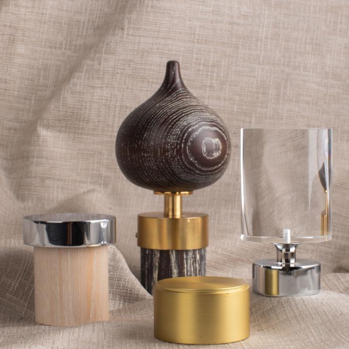 Simple yet dynamic, this striking combination contrasts metal with wood, acrylic or gloss, making a strong, confident and contemporary statement. Available in a range of colours with transparent and solid options, Halo offers multiple metal accents such as bronze, nickel and copper. Complete the look with our robust finials in chunky organic designs to add serious stature.